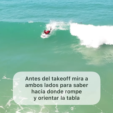 Orientación para el takeoff: Cuando veas que estás cerca del punto de ruptura y la ola te va a llevar, mira hacia ambos lados de la ola para asegurarte hacia dónde rompe la ola, y orientar tu tabla de surf en esa dirección.
